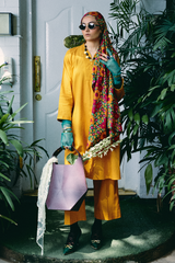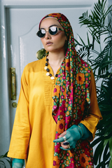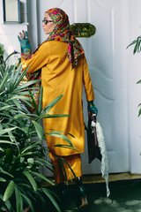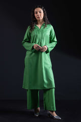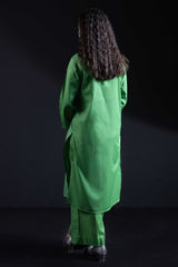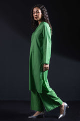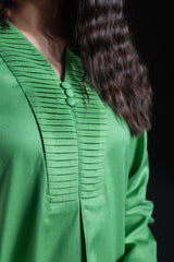 A classic-fit solid shirt with a V-neckline, adorned with pintuck fabric detailing. Paired with solid culottes for a contemporary look.