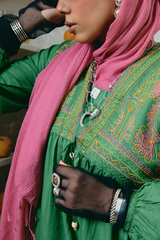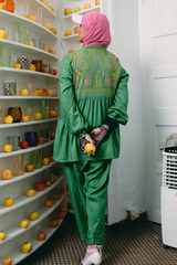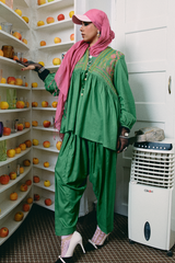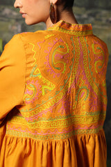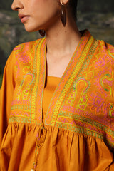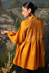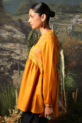 An embroidered peplum top with a V-neckline, featuring delicate embroidery on the bodice and tassel detailing. Cuffed sleeves add a structured, stylish touch. Gathers around the empire waist create a flared silhouette.