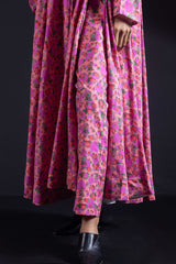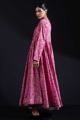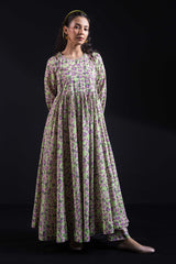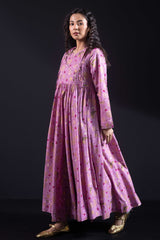 Angrakha style flared dress in luxurious gold print, with a fitted yoke, side slits, and tassel details. Gathers around the bodice create a flowing, dance-ready flare. Fitted sleeves with fine stitching on the bodice and hems. Paired with matching printed straight-fit trousers.