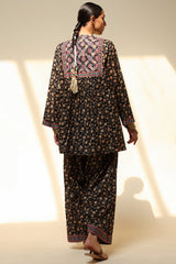 Printed short gathered shirt with a round neckline and V-slit, adorned with delicate sequin detailing along the bodice and sleeve hems. Paired with matching printed farshi shalwar for a flowing look.