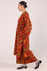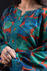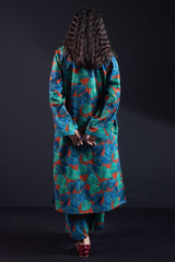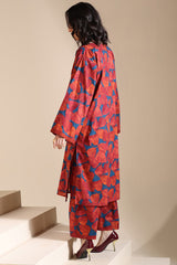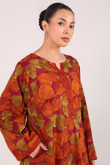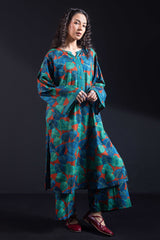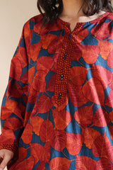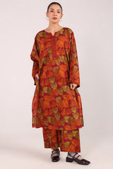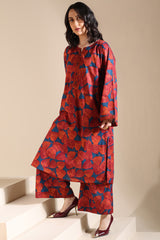 A relaxed-fit, printed kurta with a round neckline and V-slit, adorned with subtle mirror detailing on the front placket. Side pockets add functionality and comfort. Paired with matching printed culottes.