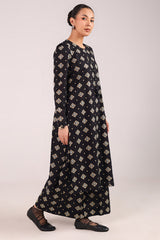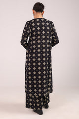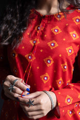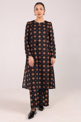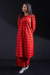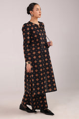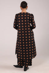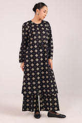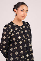 A straight-fit printed shirt with a round neckline and tassel detailing, paired with matching printed culottes.