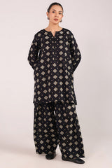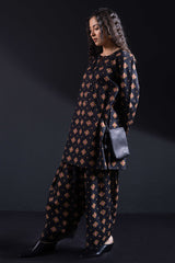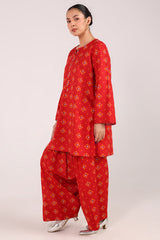 A vibrant printed shirt with a round neckline and V-slit, paired with matching printed farshi shalwar featuring intricate stitching detail on the ankle hemline.