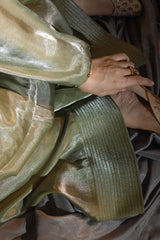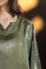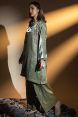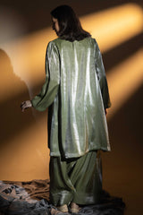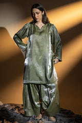 Designed in rich fabric, this loose-fit luxury shirt features a neckline delicately adorned with bead embellishments and soft pleats on the sleeves for a graceful touch. Paired with a matching farshi shalwar detailed with intricate stitching along the hemline for an effortlessly festive look.