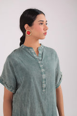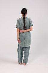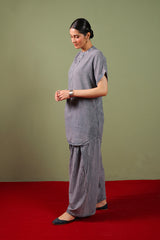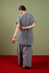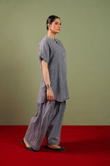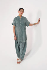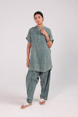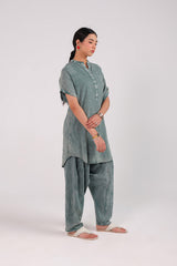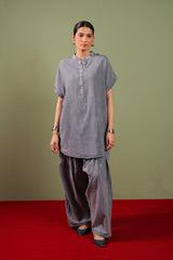 A textured shirt with delicate stitch detailing along the placket. Paired with a matching textured khula poncha shalwar.