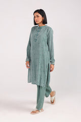 A textured shirt adorned with delicate heart-shaped embroidered motifs. Finished with frill detailing on the neckline and sleeve hems, and braid accents along the placket. Paired with a classic-fit shalwar for a chic look.