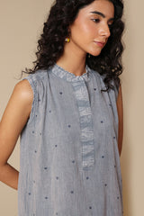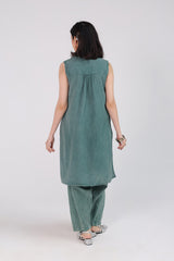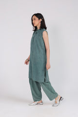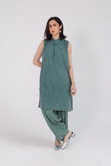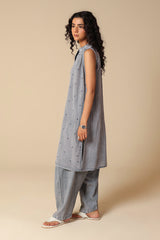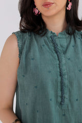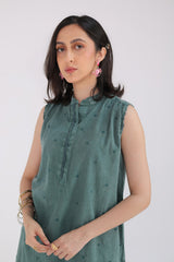 A textured shirt adorned with delicate heart-shaped embroidered motifs. Finished with frill detailing on the neckline and sleeve hems, and braid accents along the placket. Paired with a classic-fit shalwar for a chic look.