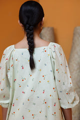 Floral printed boxy-fit shirt featuring soft puff sleeves and gently cinched hems, finished with a softly rounded hemline. Paired with coordinated printed culottes for an easy, balanced look.