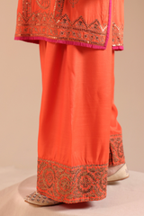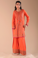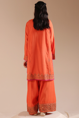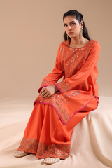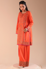 Embellished classic-fit paneled shirt with a round neckline, adorned with delicate embroidery and sequin detailing for a refined festive finish. Paired with a classic farshi shalwar, finished with embroidered borders.