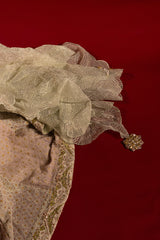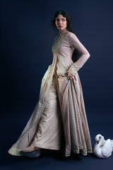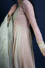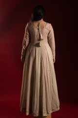 Embroidered Anarkali ensemble designed with a softly structured silhouette and fluid flare. The bodice features delicate threadwork with sequin and pearl detailing, and sleeves finished with cuff accents. Soft gathers fall from the empire line, creating a flowing flare. The back is designed with a cut-out and tie-up detail, finished with handcrafted tassels for a refined touch. Lined with soft cotton silk for ease. Styled with a sheer organza dupatta, adorned with sequin and threadwork, finished with scalloped edges and statement tassel detailing.