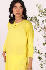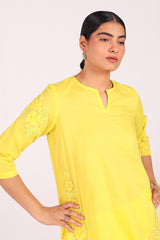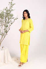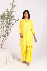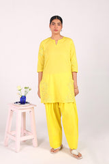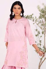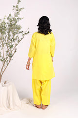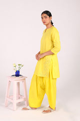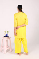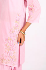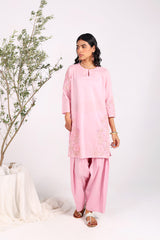 A hand-crafted kurta featuring a round neckline with a V-slit, adorned with delicate button detailing. The kurta is embellished with applique work and hand-embroidered floral motifs, including a beautiful embroidered motif on the back. Paired with a comfortable khula poncha shalwar for an effortlessly stylish look.