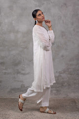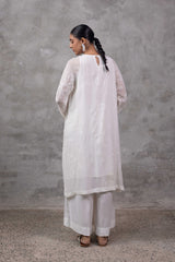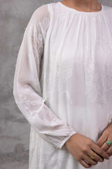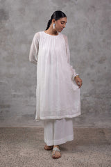 An embroidered shirt with a round neckline, detailed with soft gathers and enhanced with finely detailed embroidery. Finished with cinched sleeves and paired with classic culottes.
