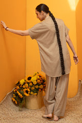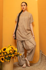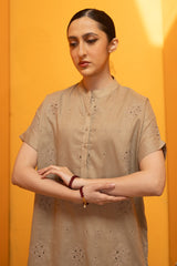 Classic-fit Schiffli shirt with a low band neckline and a buttoned front placket. Designed with subtle batwing shoulders, turn-up sleeve hems, and a rounded shirt hem. Comes with an inner for added comfort. Paired with a khula poncha shalwar, finished with Schiffli detailing along the borders.