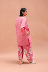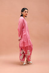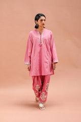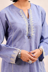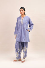 A paneled short kurta featuring a round neckline with a V-slit, adorned with delicate dori embroidery and tassel accents. The straight sleeves and shirt front are finished with dori embroidery detailing, along with side pockets for added ease. Paired with a matching classic-fit shalwar featured block printed motifs and dori embroidery details on the shalwar hem.