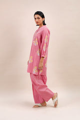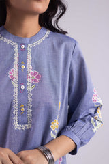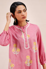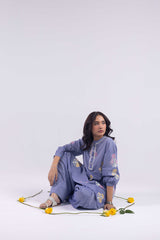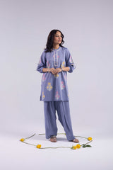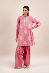 A block-printed classic fit short shirt with a rounded neckline and buttoned placket, adorned with minimal dori embroidery. Featuring block-printed three-quarter cuff sleeves. Paired with a matching loose-fit shalwar for perfect feminine fit.