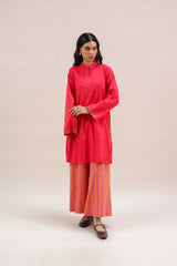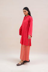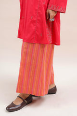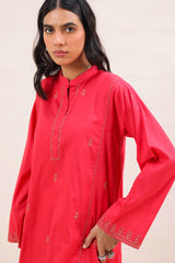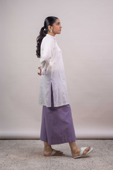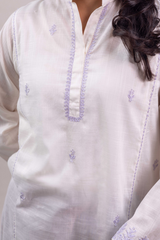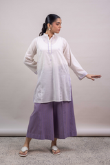 An embroidered paneled kurta featuring a round neckline with a V-slit, adorned with delicate embroidery along the placket, panels, side slits, and sleeve hems. Scattered embroidered motifs add visual interest throughout. Paired with susi-patterned culottes.