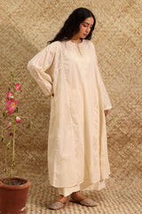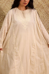 Embroidered paneled kurta on a striped base, with a round neckline adorned with delicate pleats and button detailing along the front slit. Designed with relaxed shoulders and a flared silhouette. Comes with an inner for added comfort and ease.