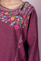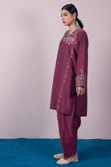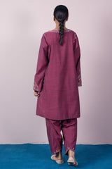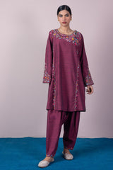 Hand-embroidered paneled shirt with a round neckline and side slit, finished with delicate embroidered detailing along the neckline, sleeves, and panels. Paired with a classic-fit shalwar, accented with embroidered borders.