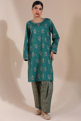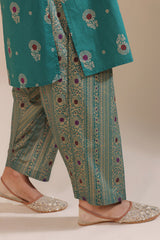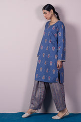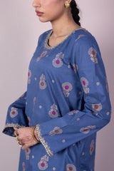 Gold-printed classic-fit shirt adorned with delicate embroidered detailing along the neckline and sleeve hems. Paired with a coordinated printed khula-poncha shalwar.