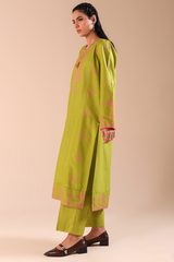 Embroidered paneled shirt with a round neckline, adorned with delicate lace detailing along the neckline and sleeve hems. Finished with subtle tassel and button accents on the front placket. Paired with classic straight-fit trousers.