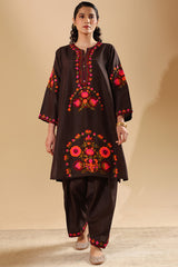 Embroidered classic-fit paneled shirt with a round neckline and a V-slit, adorned with embroidered detailing. Paired with a classic-fit shalwar finished with delicately embroidered hems.