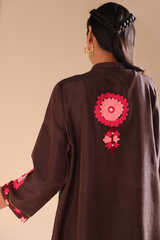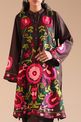 Embroidered classic-fit A-line shirt with a low band neckline and a buttoned front placket. Adorned with vibrant embroidery that adds depth and character. Paired with a classic-fit shalwar.