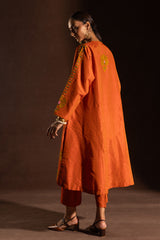 Embroidered paneled shirt with a round neckline, adorned with delicate pleat detailing and buttons along the front slit. The neckline and sleeve hems are finished with refined stitching details. Paired with classic straight-fit trousers.