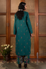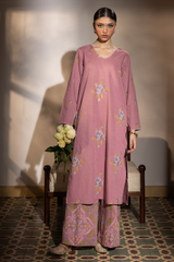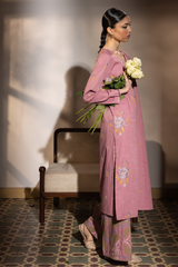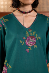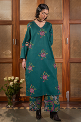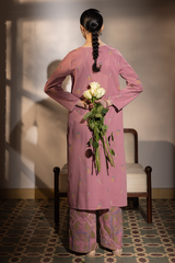 Classic-fit embroidered shirt with a V-neckline, adorned with delicate stitching along the neckline and sleeve hem. Paired with classic embroidered culottes for a refined look.