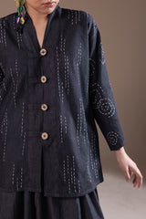 Sashiko-pattern button-down shirt featuring delicate stitching details and loop buttons along the front slit. Designed in a relaxed silhouette and paired with a classic flared denim skirt for a modern fusion look.