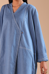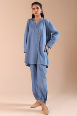 Relaxed-fit asymmetrical shirt, enhanced with Sashiko-stitching and button detailing. Designed with cuffed sleeves for a structured finish. Paired with a classic pegged shalwar, featuring cuffed hems adorned with subtle stitching patterns for a refined contemporary look.
