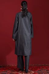 Sashiko embroidered paneled shirt with a V-neckline, adorned with delicate stitching along the neckline and sleeve hems. The Sashiko patterns elevate the look. Paired with straight-fit trousers.