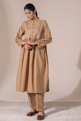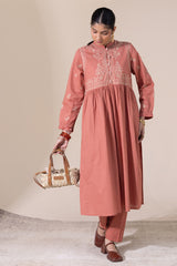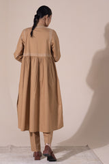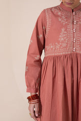 Embroidered flared shirt with a low band neckline and button detailing along the front slit. Designed with cuffed sleeve hems and soft gathers at the empire waist for a generous flared silhouette. Paired with classic straight-fit trousers.