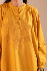 Embroidered classic-fit shirt with a low band neckline and a buttoned front placket, adorned with delicate crochet detailing along the neckline and cuffed sleeve hems. Finished with a rounded shirt hem and subtle pleat detailing at the shoulders and back for an enhanced silhouette. Paired with an embroidered classic-fit shalwar for a refined, artisanal look.