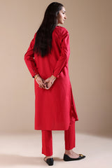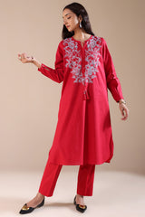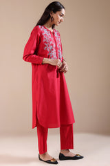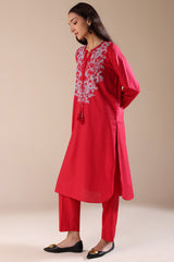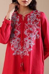 Embroidered classic-fit shirt with a round neckline and a keyhole detail, adorned with tassel accents. Finished with cuffed sleeves and a rounded shirt hem. Paired with straight-fit trousers.