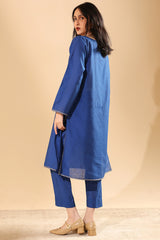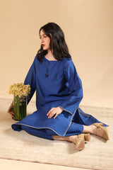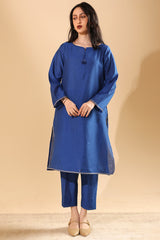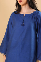Luxury classic-fit A-line shirt with a round neckline and V-slit, adorned with refined tassel detailing. Delicate embroidery accents the sleeve hems, side slits, and shirt hem. Paired with straight-fit trousers.
