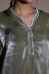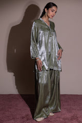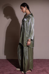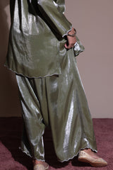 A sleek, luxe-finish classic-fit shirt featuring a soft V-neckline with scalloped detailing along the neckline, sleeve hems, and shirt hem. Paired with flared trousers finished with scalloped hems for an elegant, festive look.
