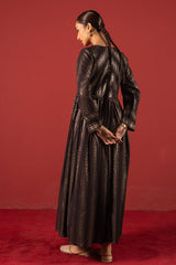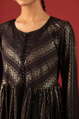 Classic-fit long flared Anarkali dress adorned with foil printing and loop buttons along the front slit. Subtle mukaish work highlights the neckline. Paired with classic straight-fit trousers.