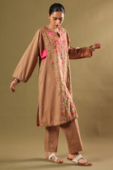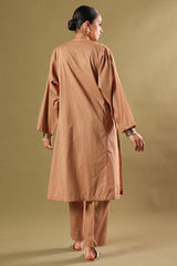 Hand-embroidered paneled kurta with a round neckline and button detailing along the front slit. Vibrant embroidery enhances the silhouette. Paired with a classic fit shalwar, finished with refined stitching accents along the borders.