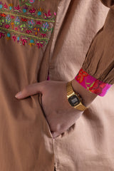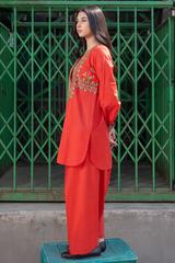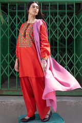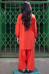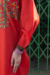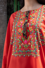 Hand-embroidered detailed shirt adnored with buttons along the front placket and intricate hand-embroidery on the bodice. Designed with cuffed sleeves, side pockets, and a rounded hem for ease. Paired with a farshi shalwar accented with delicate stitching along the ankle hemline for a timeless finish.