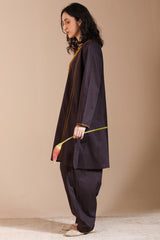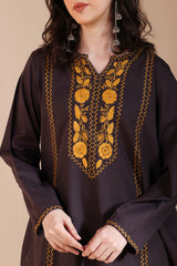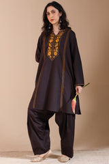 Hand-embroidered paneled shirt with a round neckline and V-slit, paired with a classic-fit shalwar for a sophisticated look.
