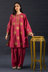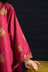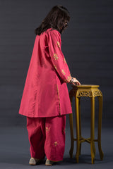 Hand-embroidered paneled kurta with a round neckline and V-slit, adorned with delicate embroidery and refined aina work. Paired with coordinated embroidered khula poncha shalwar.