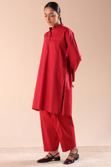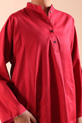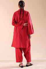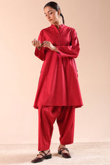 Paneled kurta with a low band neckline, detailed with heart-shaped button accents along the front placket and side slits. Paired with a classic-fit shalwar for a balanced, refined look.