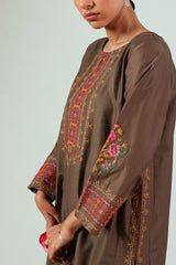 Embroidered classic-fit paneled shirt with a round neckline and keyhole detail, adorned with delicate embroidery. Designed with subtle drop shoulders, paired with straight-fit trousers.