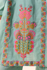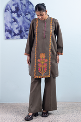 A cross-stitch embroidered classic-fit paneled shirt with a low band neckline and buttons along the front placket, adorned with crochet lace detailing on the placket and sleeve hems. Paired with bell-bottom trousers for a contemporary finish.