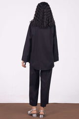 A classic-cord set featuring a paneled shirt with a round neckline and overlap, adorned with colorful stitching on the placket and sleeve hems, with draped shoulders. Paired with straight-fit trousers.