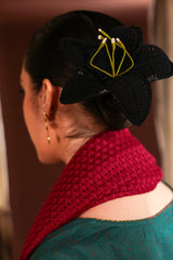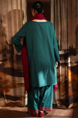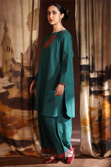 Classic-fit shirt on a speckled base, with a round neckline adorned with subtle stitching detail. Applique and embroidered accents elevate the bodice and sleeve hems, while the rounded hem adds a refined finish. Paired with a farshi shalwar featuring matching patchwork and embroidery on ankle hemline.