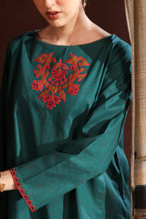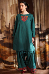 A classic-fit shirt on a speckled base, featuring a round neckline adorned with subtle stitch detailing. Appliqué and embroidered accents elevate the bodice and sleeve hems, while a rounded hem adds a refined finish. Paired with a farshi shalwar showcasing matching appliqué and embroidery along the ankle hemline for a cohesive, elegant look.