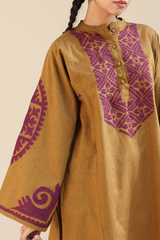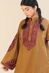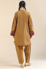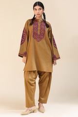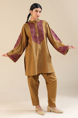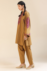 An appliquéd paneled kurta with a low band neckline and a buttoned front placket. Crafted on a speckled base, the shirt is adorned with classic appliqué and embroidered detailing. Paired with a speckled classic-fit shalwar.