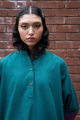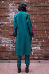 Appliquéd classic-fit shirt with a low band neckline, adorned with delicate stitching detail and a buttoned front placket. The cuffed sleeves features appliqué and embroidered work, finished with crochet lace along the hems. Paired with speckled straight-fit trousers.