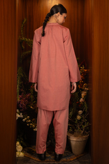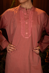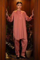 An embroidered classic-fit shirt with a low band neckline and buttoned front placket, adorned with frill detailing on the neckline and sleeve hems. Finished with a round shirt hem and paired with a classic-fit shalwar featuring embroidered detailing on the ankle hemline.